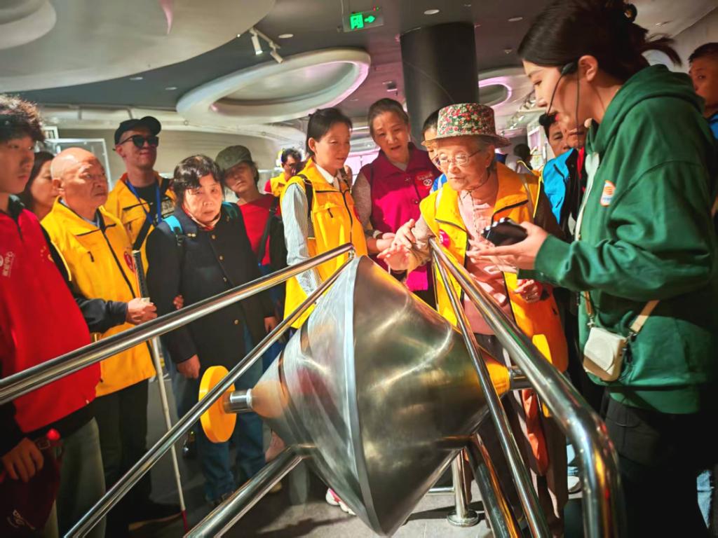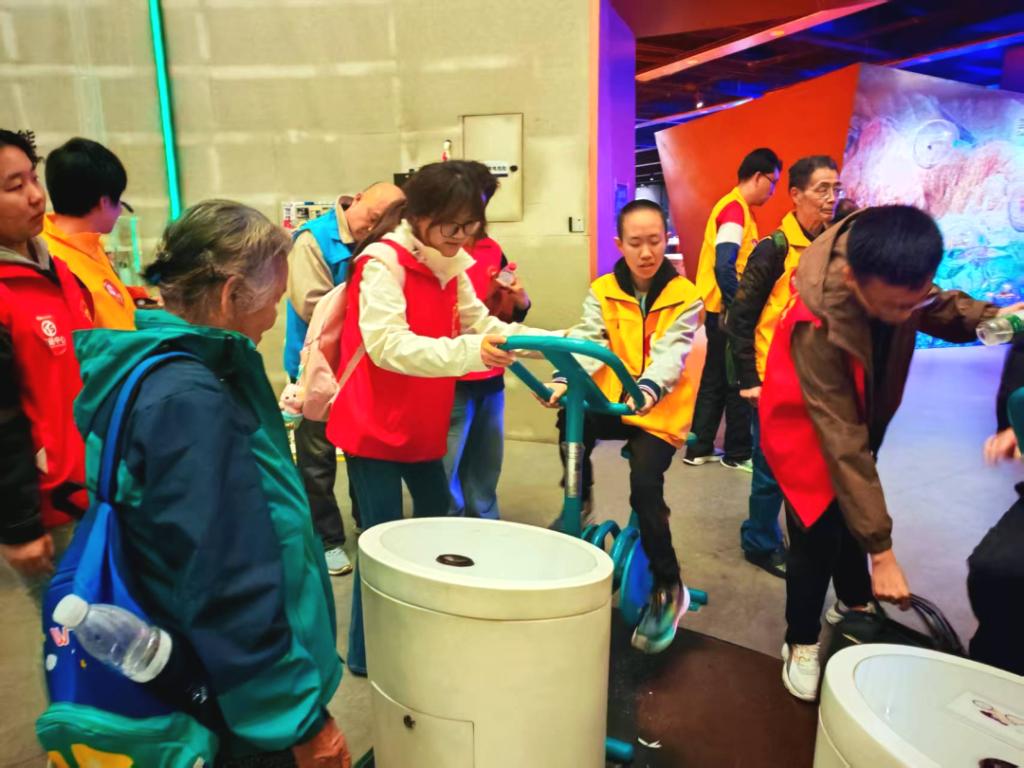 当视障朋友体验电磁秋千、不同星球提重物等互动设施时,队员们全程守护在侧。他们耐心讲解设备操作方法,手把手指导操作步骤,及时告知注意事项,确保每位视障朋友都能安全、顺利地完成体验。视障人士刘阿姨在体验后感动地说:“多亏了这些志愿者,他们比家人还细心,让我不仅摸到了科技,还‘看懂’了科技。”