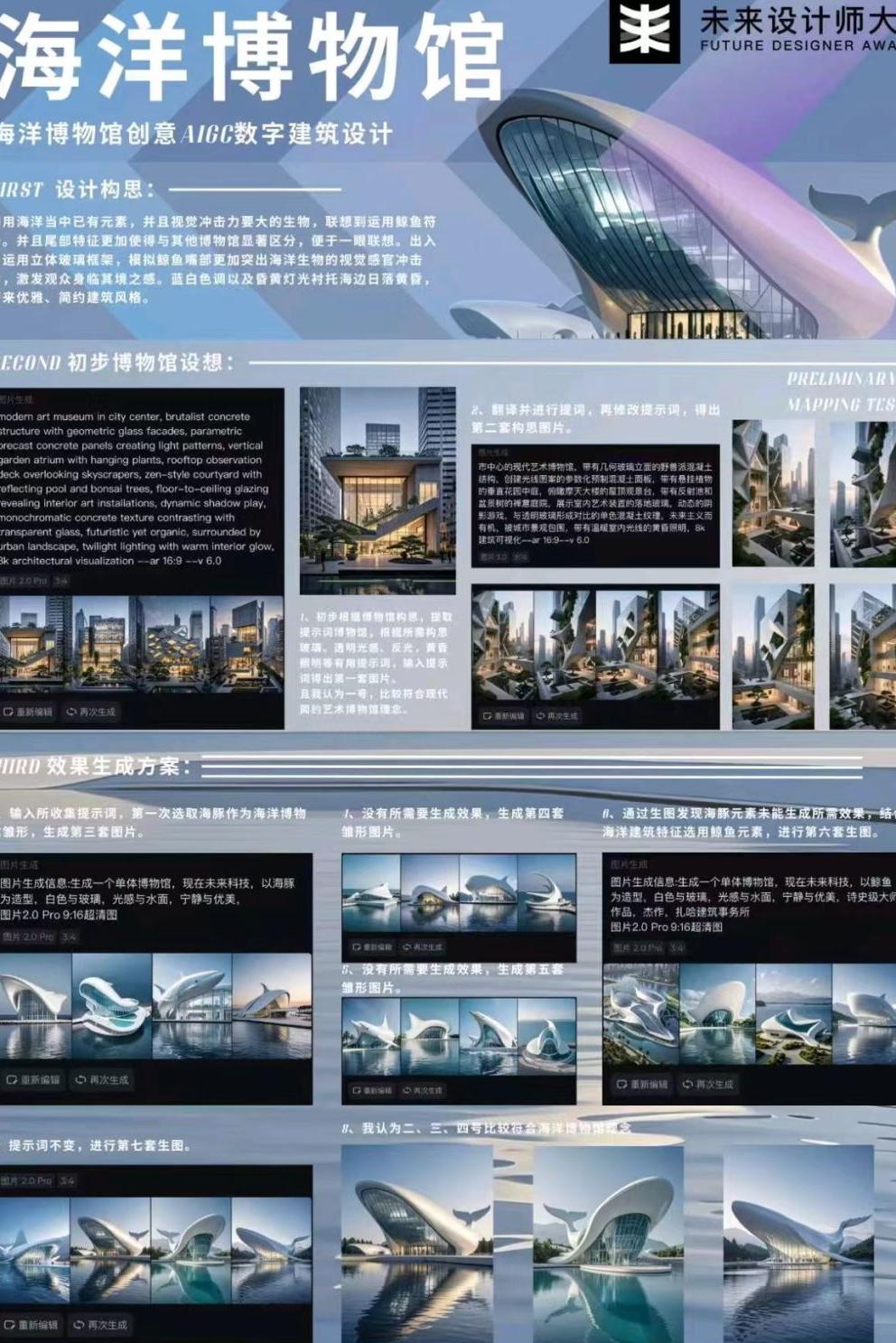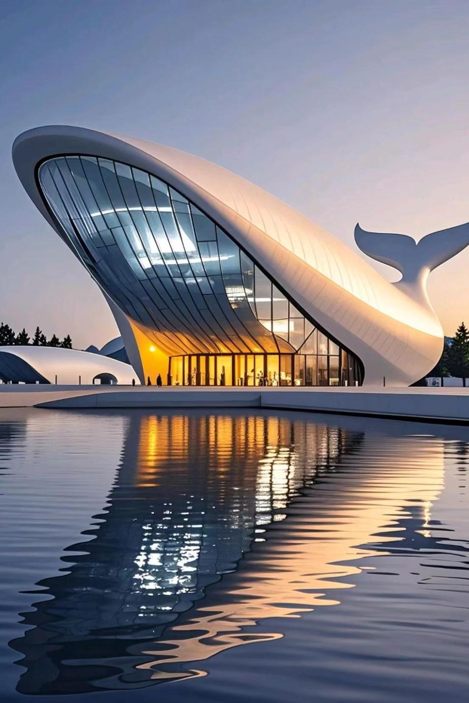 设计旨在打造一座面向未来的海洋博物馆,超越传统的陈列功能,成为连接认知、科技与生态的精神场域。设计以鲸鱼为核心符号,借助其庞大的体态与独特的尾部造型,构建出极具视觉冲击力的建筑意象,既强化识别度,也唤起观者对海洋的沉浸想象。入口处以立体玻璃框架模拟鲸鱼嘴部形态,增强感官体验,引领观众步入深海情境。建筑整体以蓝白为主调,辅以昏黄灯光,呼应海边日落时分的静谧与浪漫,营造优雅而简约的艺术氛围,传递出人与海洋共生的未来愿景。