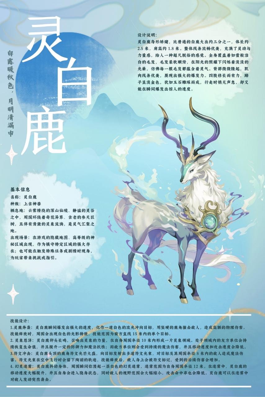 作品以中国传统文化中的白鹿为原型,凸显其纯洁与灵性。灵白鹿体态矫健,比寻常白鹿大出约三分之一,体长约2.5米,肩高近1.8米,身形流畅而充满力量感,超凡脱俗。通体覆满如雪的白毛,柔软莹润,在阳光下泛着淡淡光晕,仿佛每根毛发都蕴含灵气。其背脊微隆,肌理优美,蕴藏强劲爆发力;四肢修长有力,淡金色的蹄子宛若玉琢,行走时悄无声息,却能于瞬息间爆发出惊人速度。灵白鹿常出没于隐藏地图或高等级秘境,作为一方区域的守护者,亦可能在特殊剧情中被触发,为玩家带来试炼或指引前路。