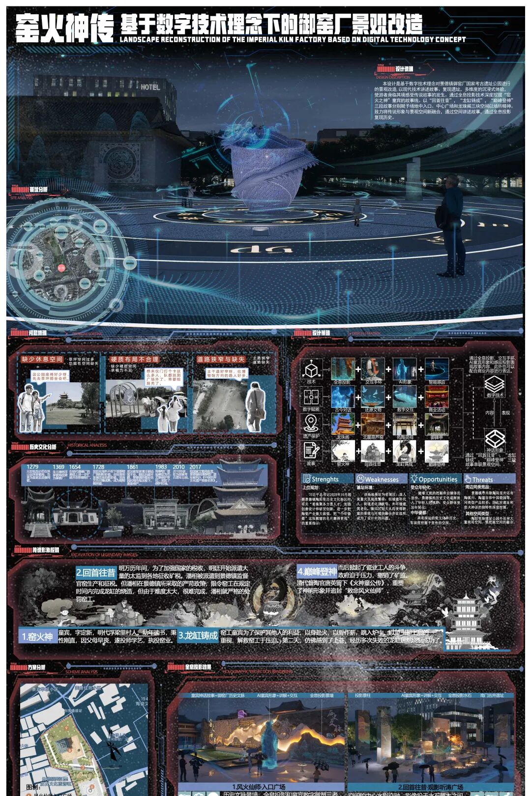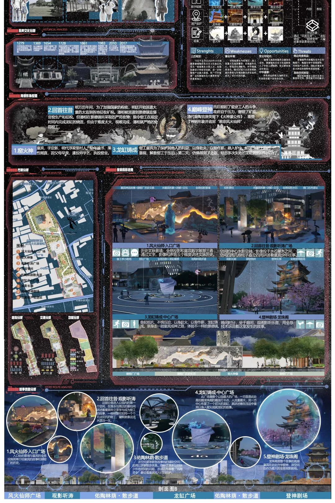 设计聚焦景德镇御窑厂国家考古遗址公园,突破传统景观改造模式,以数字技术为核心,构建多维度沉浸式体验空间,引领游客身临其境感受御窑文化的厚重历史与窑火传说的奇幻魅力。设计深度提炼“窑火之神”童宾的传奇经历,将“回首往昔”“龙缸铸成”“巅峰登神”三大情节,分别融入入口、中心广场与龙珠阁三大区域,实现神话叙事与景观空间的有机交融,使每处场所皆成为历史的“讲述者”。作品以御窑夜色为幕布,依托全息投影生动复现历史场景,将文化传承与现代科技碰撞,打造可游可赏的夜游体验,为古老遗址注入全新生命,推动文化遗产的数字化活化与传播。