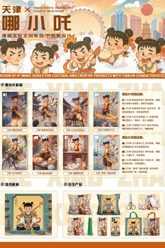 设计以神话人物“哪吒”为原型,融合天津三大文化基因——饮食、曲艺与漕运记忆,塑造出一位兼具童真、英气与烟火气的城市守护童神“哪小吒”。形象设计中,十八街麻花作风火轮、包子蒸笼演绎为乾坤圈、火尖枪融入快板元素,勾勒出既富中国风韵、又洋溢津门特色的视觉符号体系。借助AI生成工具高效拓展角色场景与风格演绎,探索“人工智能+设计”的创新路径,回应新质生产力背景下文化表达的革新需求。作品延伸至明信片、表情包、墙绘及衍生品等多种载体,构建出可传播、可共创的城市文化IP生态,以设计激活文化,以科技赋能创意,展现中华优秀传统文化在数字语境中的转化与生长。