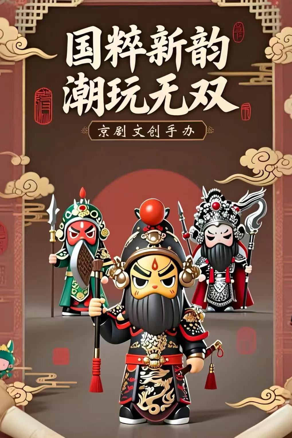 文创从中国传统京剧脸谱中汲取灵感,以“泡泡玛特”的萌系风格重新诠释经典戏曲人物,实现国粹美学的当代转译,拉近脸谱文化与大众的距离。设计巧妙解构脸谱的色彩与纹样符号,将关羽之“忠”、张飞之“勇”、曹操之“奸”等性格特质,融入大头小身的Q版造型与柔和线条中,展现统艺术与现代审美的生动融合。作品以鲜明色彩传递人物性格,经典图式延续历史身份,使角色跨越时空界限,成为传统与潮流交织的文化结晶,共同续写中华文化自信的新篇章。