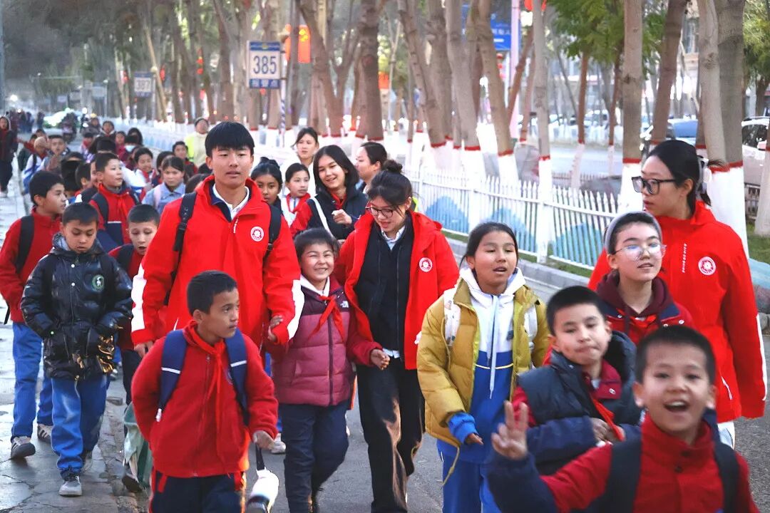 每当夜幕低垂,学生们在校门口整齐列队,等待老师们护送回家。回家路上,我们牵着温热的小手走过尘土飞扬的乡道,在卡车驶过时将孩子们护在身后。他们时而蹦跳着踩碎月光的银屑,时而举起捡到的胡杨落叶献宝似的递来。某个瞬间,当我们低头看见掌心包裹着的小手,突然明白这看似平凡的护送,实则是用最温柔的步履丈量着童年与成长的距离。