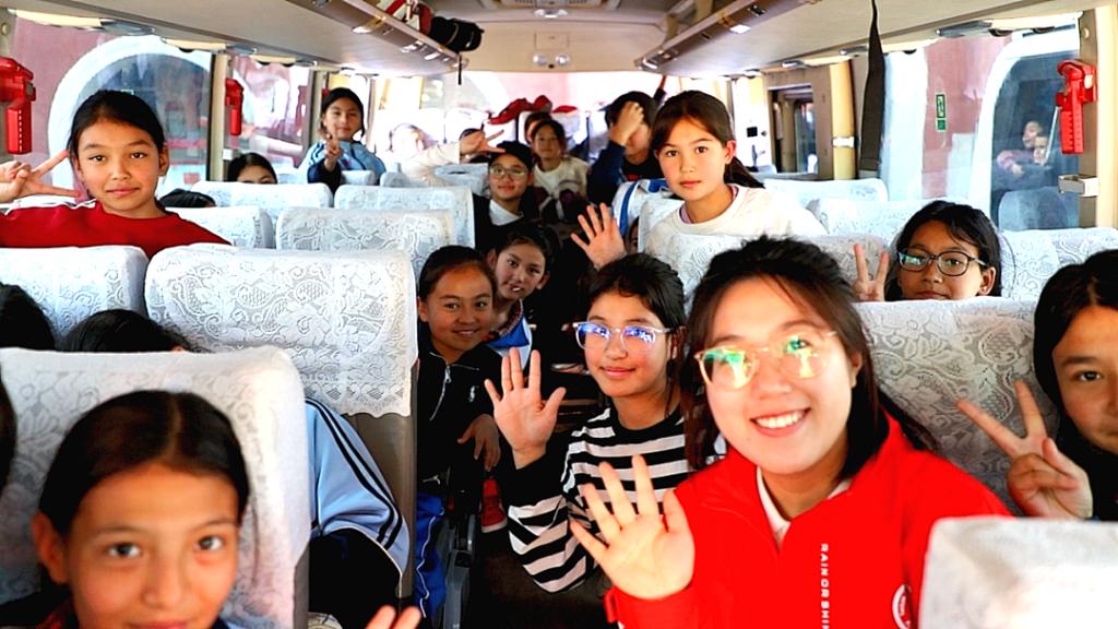住在塔克拉玛干沙漠腹地达里雅布依乡的学生,因为路途距离学校100公里,只能周末乘车回家。在回家路上,我们与孩子们在车厢里唱歌、做游戏,悦耳的童声让原本有些漫长的路途变成了充满欢乐的海洋。这条每周往返的求学路,成了这些住在沙漠边缘孩子们走向更广阔未来的成长“天路”。